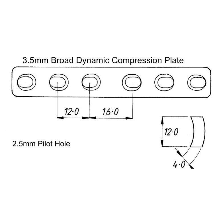 The dynamic compression plate has been the standard setting implant for human and veterinary orthopaedics for decades. It continues to be our most popular plate style. The design of the plate holes allows for a large range of screw insertion angles compared to round holes. Fracture compression permits primary bone healing with minimum callus. Placing a screw at the end of a plate hole furthest from the fracture will compress the fractured bone ends together as the screw is tightened. Compression plates can also be used in neutralisation and bridging modes. Care needs to be taken in bridging mode as the plate is subject to greater bending forces that can cause premature failure.